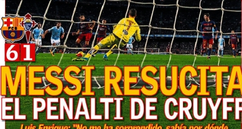 E proprio a Cruijff, come riportano i quotidiani spagnoli, è dedicato il rigore calciato da Messi: due giorni fa, infatti, l'ex campione di Barcellona e Ajax ha annunciato i propri miglioramenti nella lotta contro il cancro. Mundo Deportivo, quotidiano catalano, definisce "Geniale" la trovata di Messi, mentre per Sport è "Show totale".